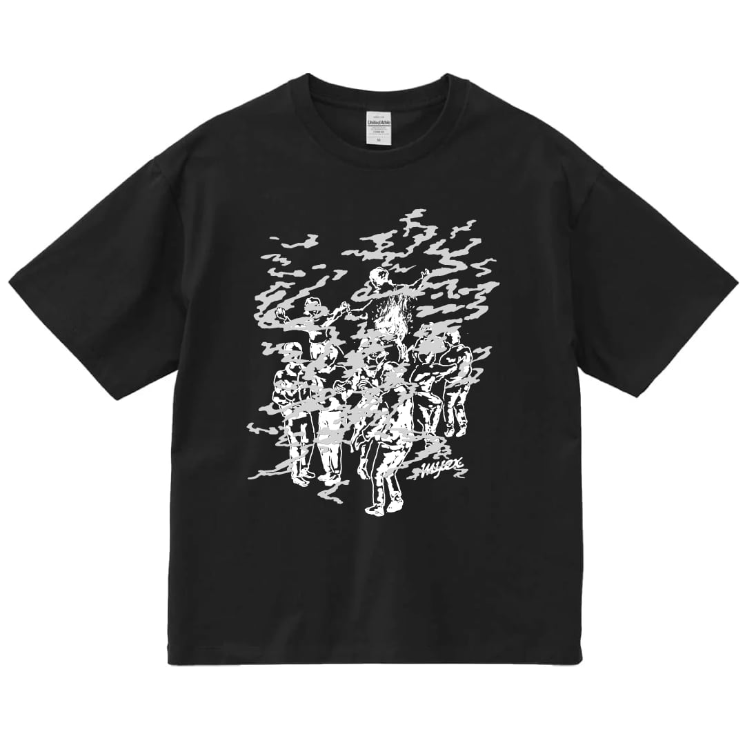 ボディは「united athle 6.5オンス ファインジャージー ボックスシルエット 1108-01」を使用しています。生地は6.5オンスとしっかりとした厚みがあり着丈が短く身幅は広いボックスシルエットタイプのTシャツです。Tシャツのサイズチャートは4枚目の画像を参照してください。